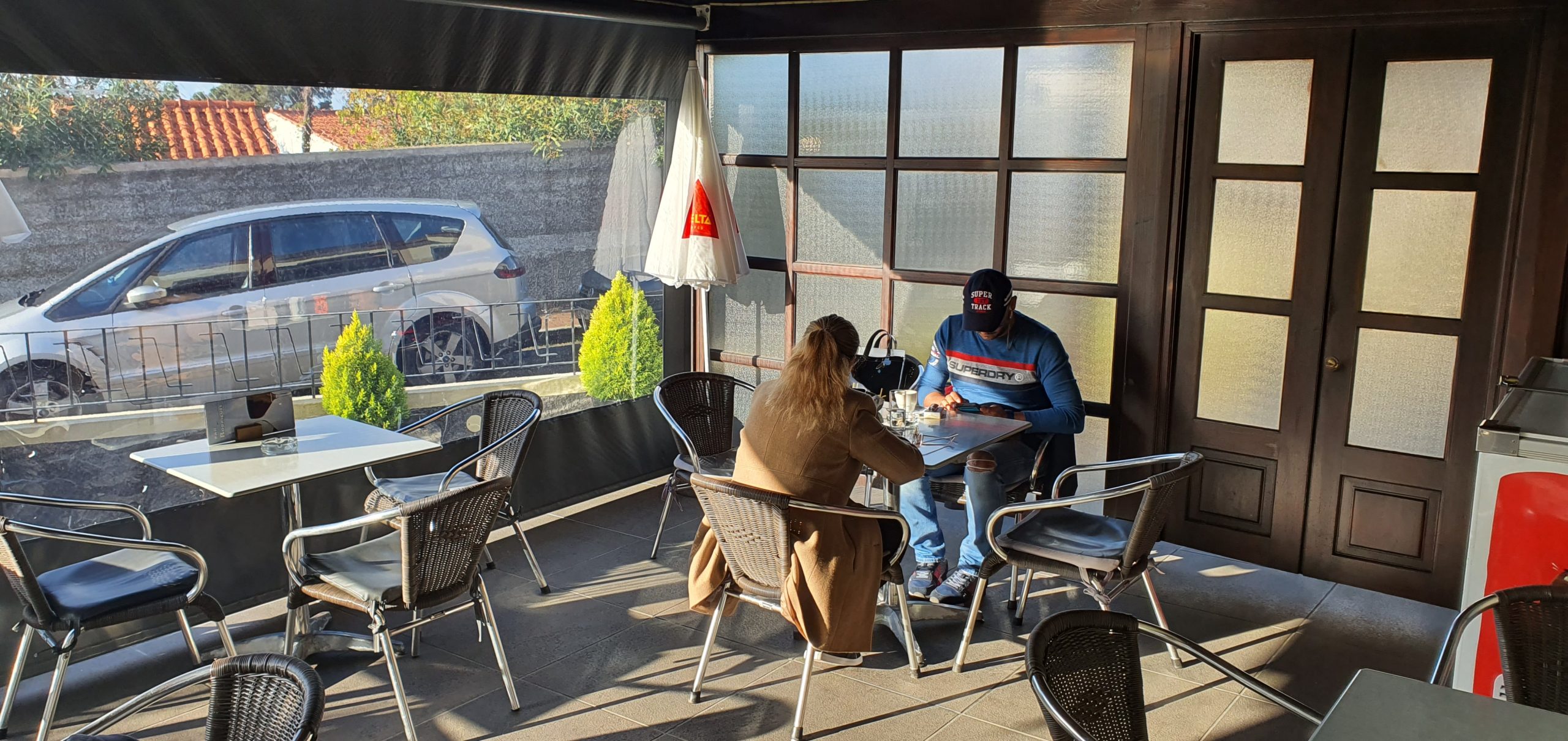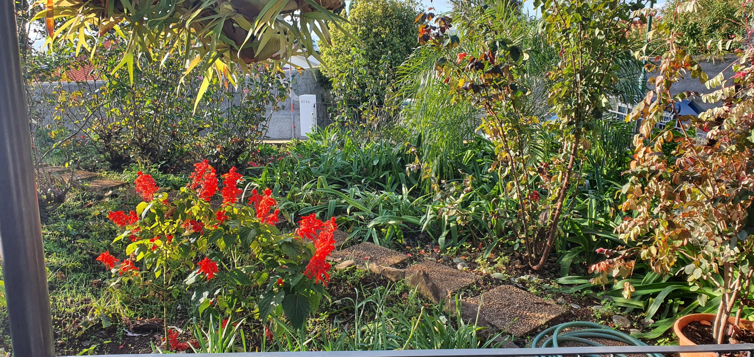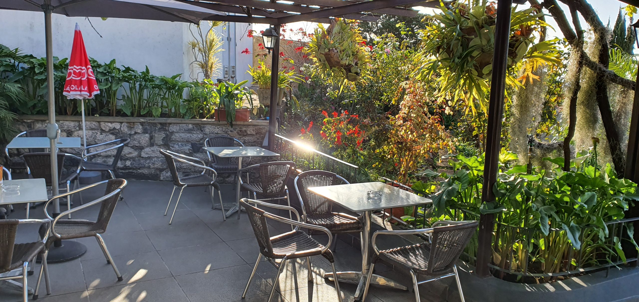 They only do small snacks, toasted sandwiches, a few cakes, all outside seating, covered and uncovered with grapevines above, and a garden full of flowers that you expect to see in Madeira.