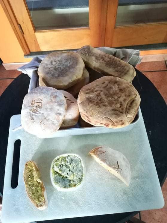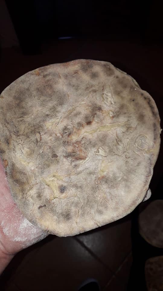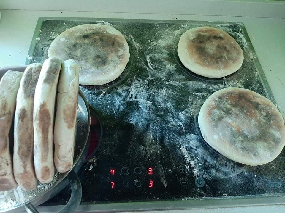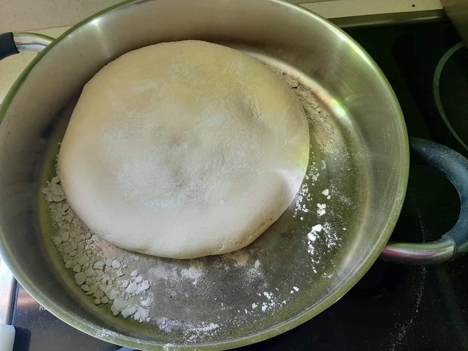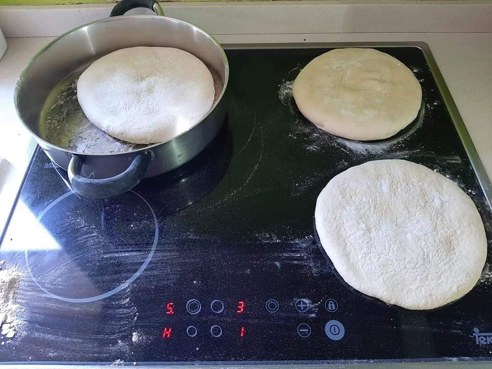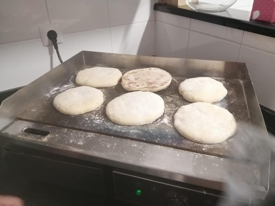 EN-If someone wants to do it at the same time as Luis by video call, they must have the following ingredients at hand; 1 liter cold water, 2kg Flour, 200g sweet potatoes (roasted and skin removed), 50g salt, 50g dry powder yeast, a bowl or something like that. He used an electric plate to bake the Bread, you as an option have the frying pan or in the last case oven! Look in the gallery below to see how some people baked theirs. Note he only put 1 kg of flour in at first then added more as needed.