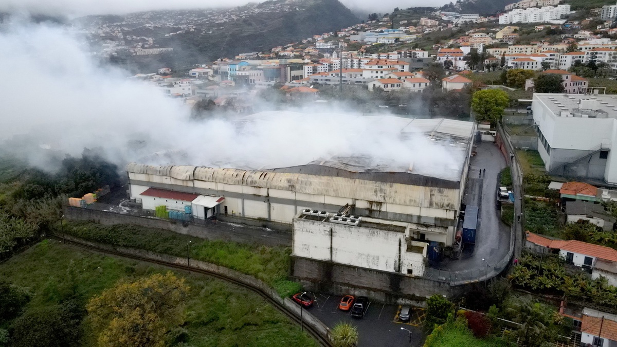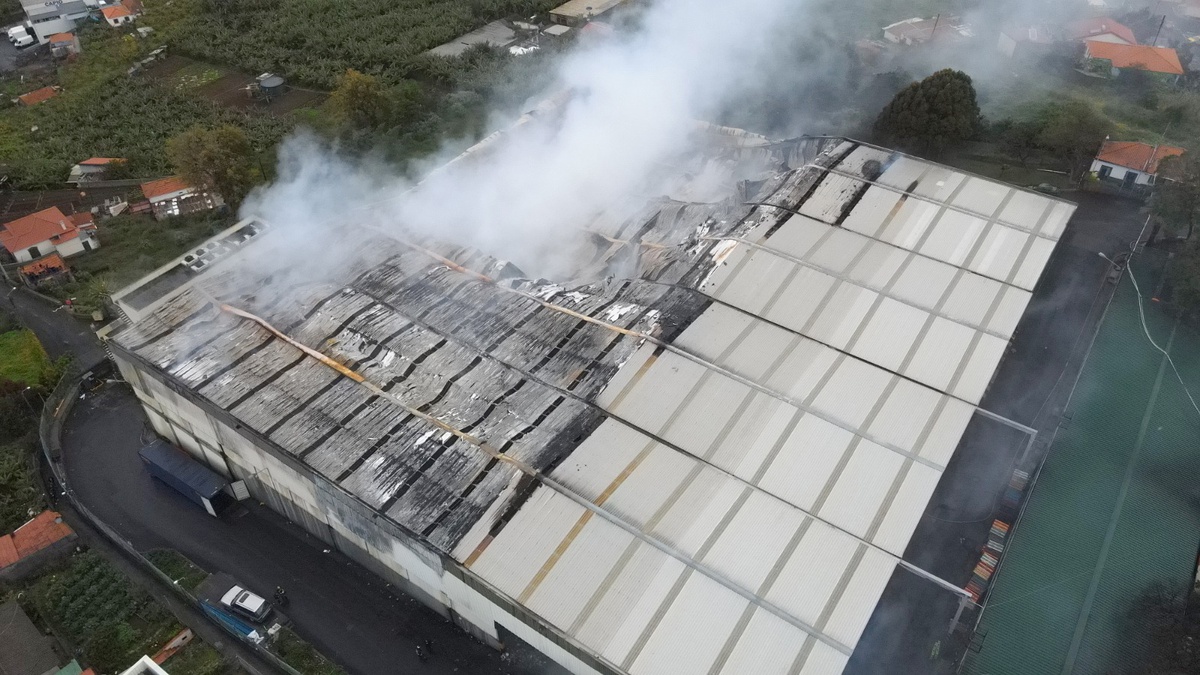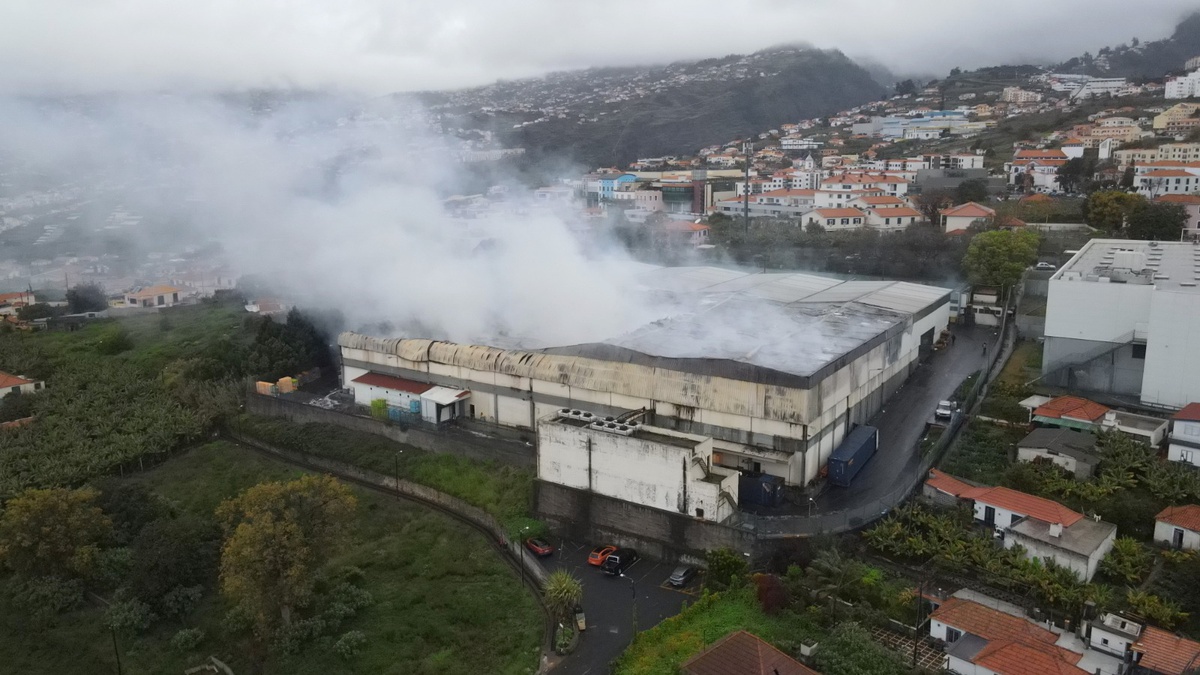 The aerial images captured by DIÁRIO show that more than half of the Jerónimo Martins warehouse, in São Martinho, was charred due to the fire that broke out on Saturday night.