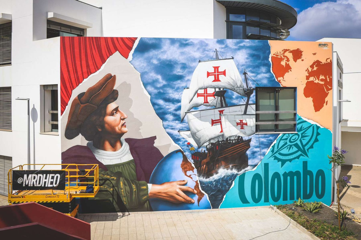 Mr. Dheo pressed the valve of 140 cans over “more or less” a week to complete the work that is inaugurated today in Ilha Dourada. Cristóvão Colombo is the figurehead of this latest work by the ‘street art’ artist from Porto, which comprises a ‘canvas’ measuring over 100 square metres.