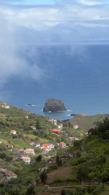 At certain bends the view stretches suddenly outward toward Porta da Cruz far below. The village rests between the mountains and the sea, its fields and houses gathered like a small painting against the Atlantic.